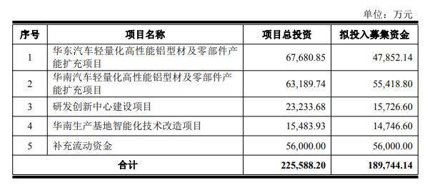 豪美新材上市募集资金总额为636,862,713.48元,扣除发行费用后募集资金净额为589,893,500.00元。2020年5月6日披露的招股书显示,公司拟募集资金58,989.35万元,用于铝合金新材建设项目、研发中心建设项目、补充流动资金。