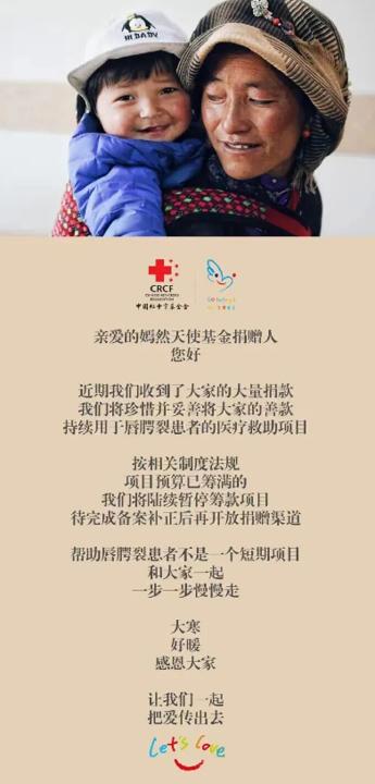 1月20日,@嫣然天使基金 发文感恩大家:近期我们收到了大家的大量捐款,我们将珍惜并妥善将大家的善款,持续用于唇腭裂患者的医疗救助项目。按相关制度法规,项目预算已筹满的我们将陆续暂停筹款项目,待完成备案补正后再开放捐赠渠道。