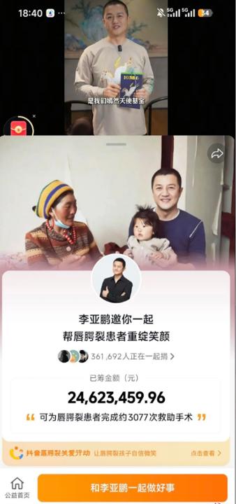 视频中,李亚鹏称前两天直播时曾承诺,所有直播间打赏的礼物自己都会提现后替大家捐给嫣然天使儿童医院,李亚鹏称,从来没有收到过这么多礼物,感谢大家。并称近期直播收到平台分账金额29万元,已全部捐给儿童医院。并且已备注是替网友捐赠。