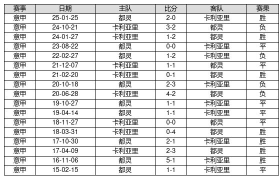 都灵 VS 卡利亚里两队近10年的交战次数为17场,都灵7胜6平4负,赢球概率为41.2%,平局概率为35.3%,输球概率为23.5%。