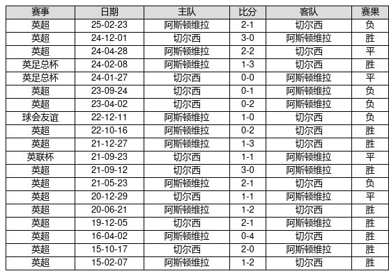 切尔西 VS 阿斯顿维拉两队近10年的交战次数为19场,切尔西10胜4平5负,赢球概率为52.6%,平局概率为21.1%,输球概率为26.3%。
