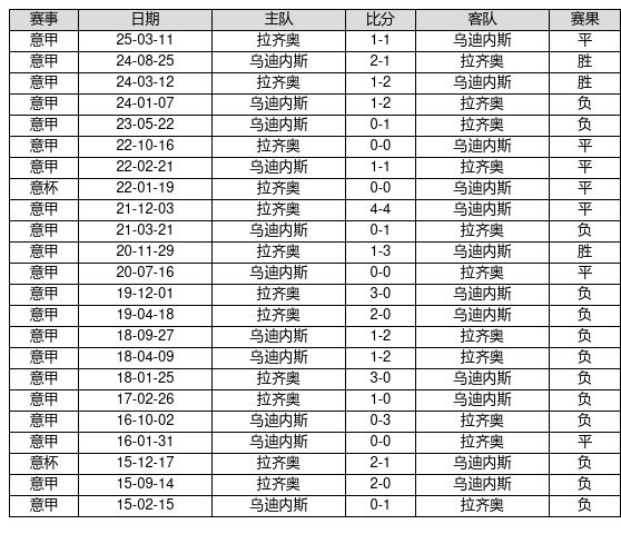 乌迪内斯 VS 拉齐奥两队近10年的交战次数为23场,乌迪内斯3胜7平13负,赢球概率为13.0%,平局概率为30.4%,输球概率为56.5%。