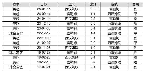 西汉姆联 VS 富勒姆两队近10年的交战次数为13场,西汉姆联8胜3平2负,赢球概率为61.5%,平局概率为23.1%,输球概率为15.4%。