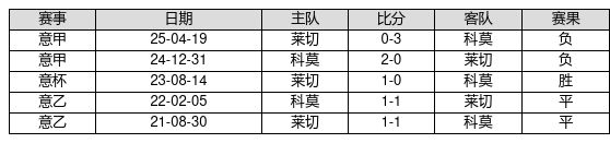 莱切 VS 科莫两队近10年的交战次数为5场,莱切1胜2平2负,赢球概率为20.0%,平局概率为40.0%,输球概率为40.0%。