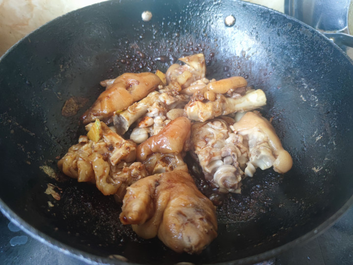 2.锅中入油下入冰糖炒出糖色,然后下入猪蹄翻炒均匀,烹入料酒和一品鲜酱油把猪蹄炒上色,然后下入干辣椒和葱姜蒜跟猪蹄一起炒香,加入开水没过猪蹄。
