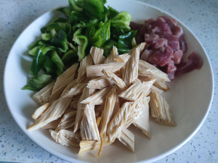 1.腐竹泡发后攥干水分斜刀切成菱形段,猪五花肉切成薄片,青椒洗净去除根蒂切成小块。
