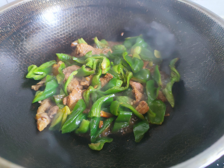 2.锅中入油爆香大蒜粒,下入五花肉煸炒至变色,然后烹入料酒和一品鲜酱油把猪肉炒上色,锅中下入青椒块翻炒均匀。