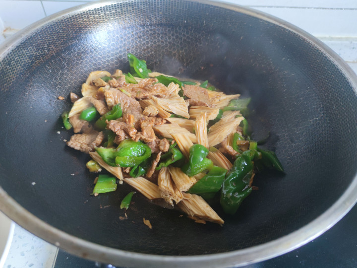 3.炒至青椒变软以后添入适量汤汁,加入腐竹,烧至汤汁都被腐竹吸收以后,加入盐和蚝油调味,即可出锅享用。