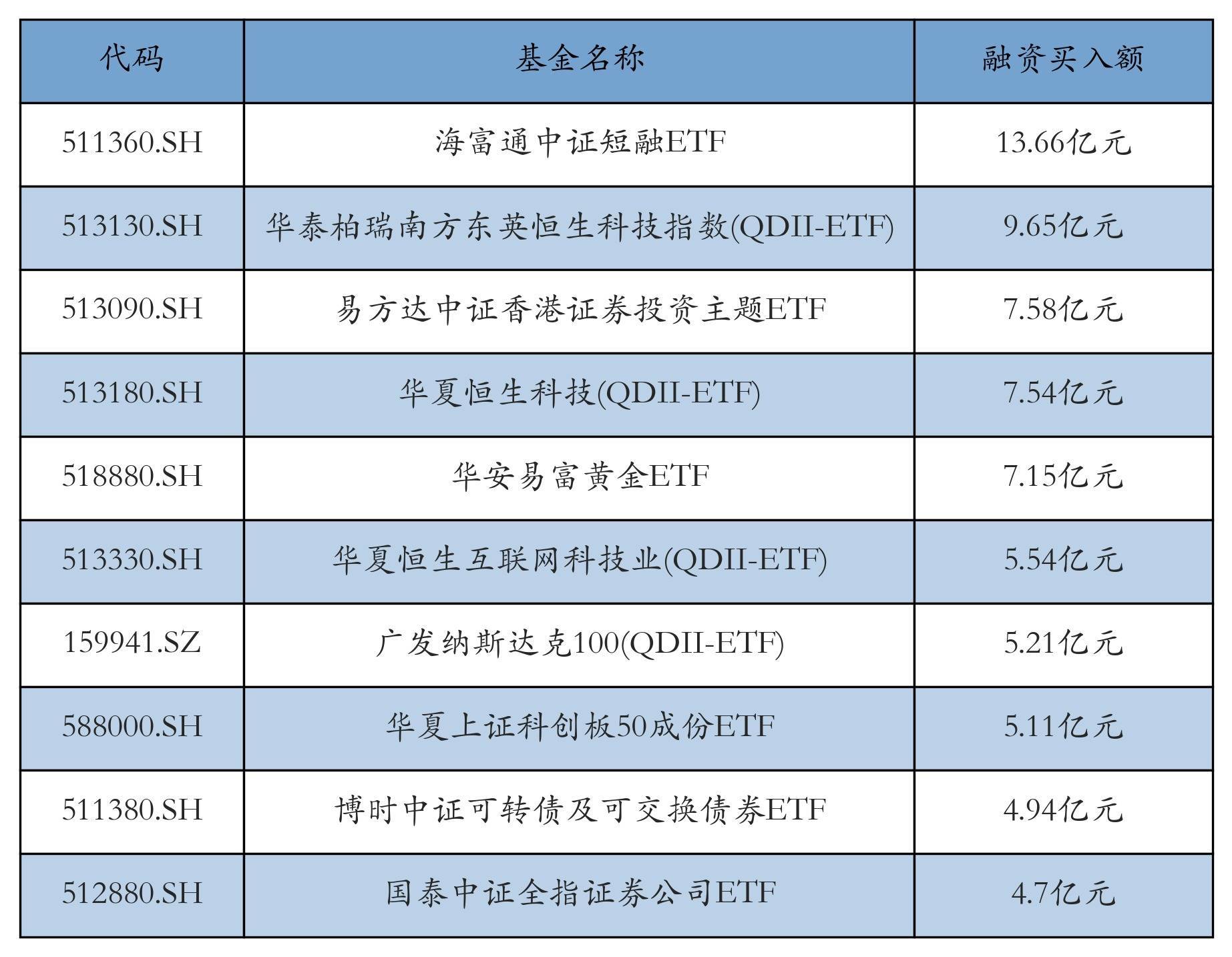 11月17日ETF融资买入额前三位分别为:海富通中证短融ETF(13.66亿元)、华泰柏瑞南方东英恒生科技指数(QDII-ETF)(9.65亿元)和易方达中证香港证券投资主题ETF(7.58亿元),前10具体见下表: