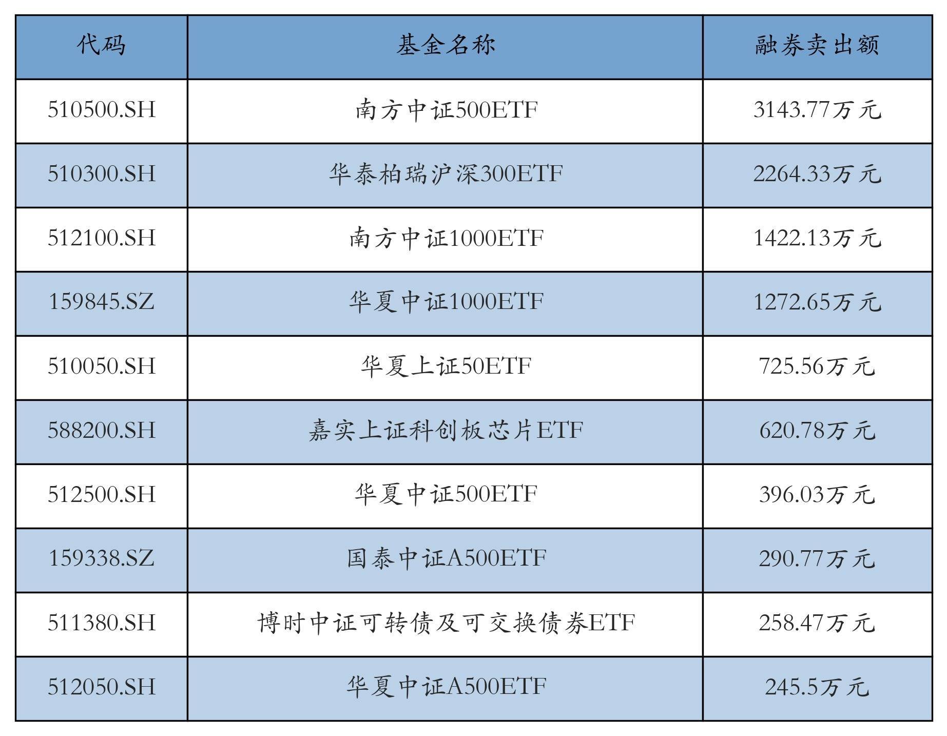 11月17日ETF融券卖出额前三位分别为:南方中证500ETF(3143.77万元)、华泰柏瑞沪深300ETF(2264.33万元)和南方中证1000ETF(1422.13万元),前10具体见下表: