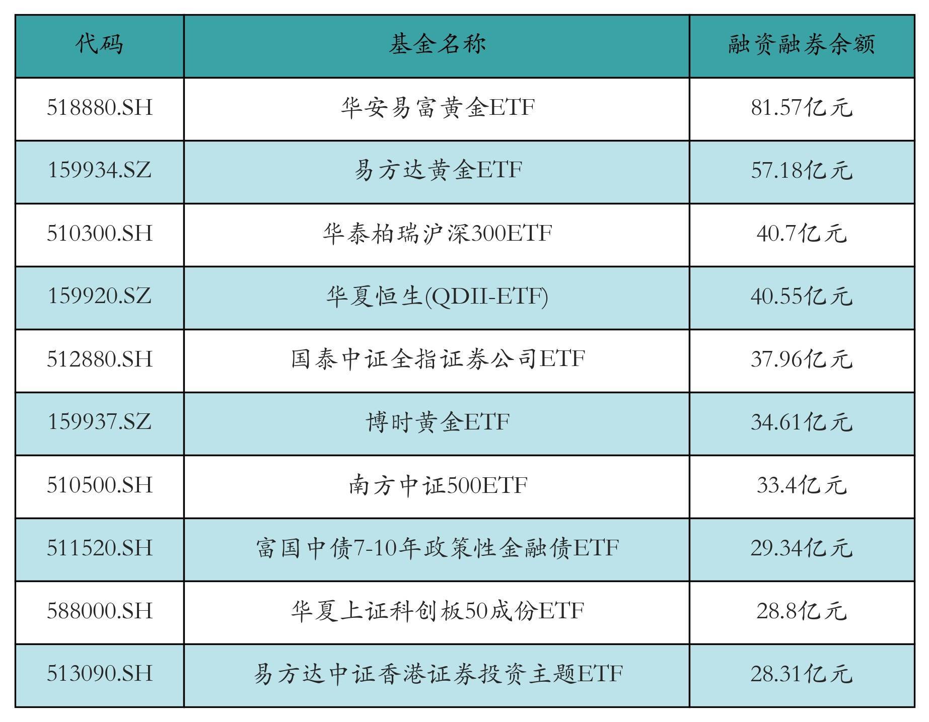 11月17日ETF两融余额前三位分别为:华安易富黄金ETF(81.57亿元)、易方达黄金ETF(57.18亿元)和华泰柏瑞沪深300ETF(40.7亿元),前10具体见下表: