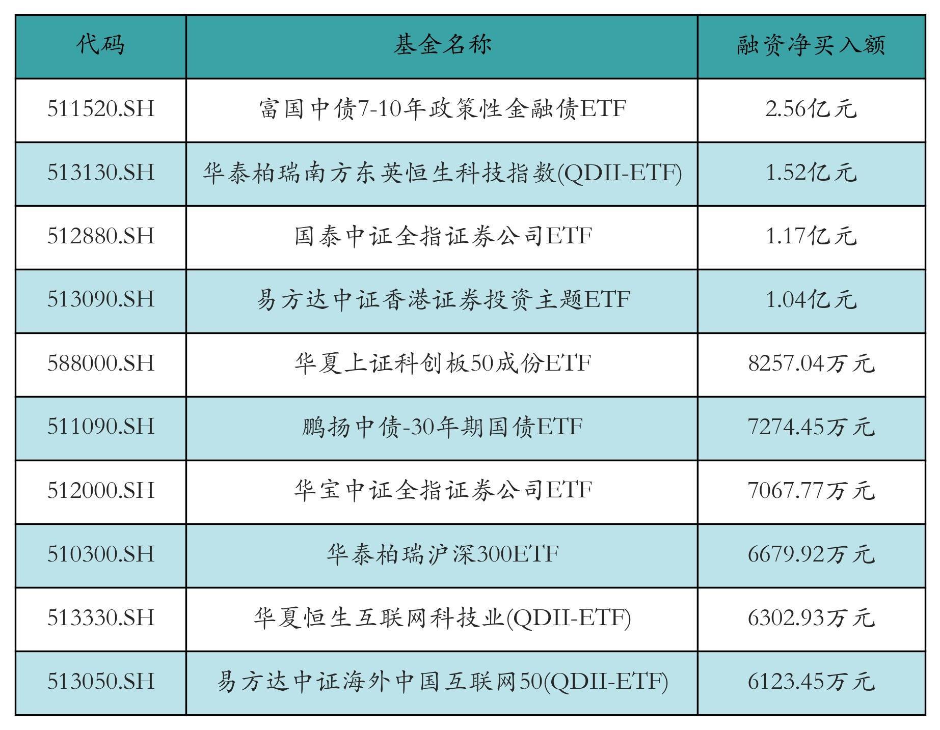 11月17日ETF融资净买入额前三位分别为:富国中债7-10年政策性金融债ETF(2.56亿元)、华泰柏瑞南方东英恒生科技指数(QDII-ETF)(1.52亿元)和国泰中证全指证券公司ETF(1.17亿元),前10具体见下表: